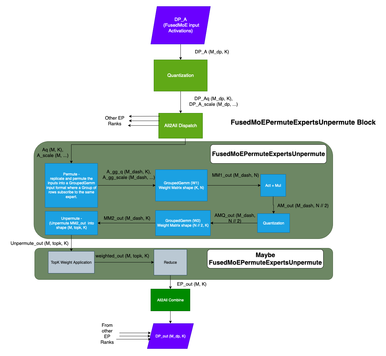 DeepEPHTPrepareAndFinalizefor an example. - In the Batched variant, the All2All Dispatch returns the activations as a tensor of shape (num_experts, max_tokens, K). Here, the activations/tokens that subscribe to the same expert are batched together. Note that not all entries of the tensor are valid. The activations tensor is typically accompanied by an